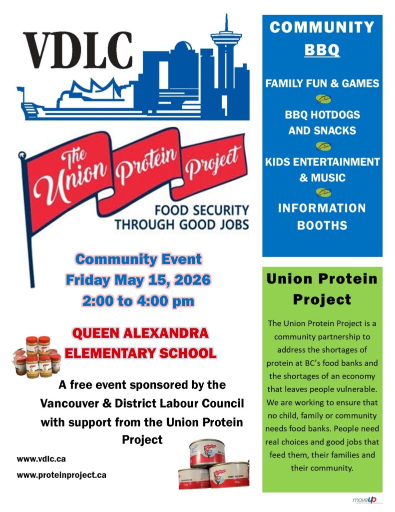 Each year we invite all affiliates to participate in our community event with the Union Protein Project. This family-friendly celebration brings together the students and community from Queen Alexandra Elementary School, food bank clients, labour leaders and activists, and representatives from community-based service organizations.